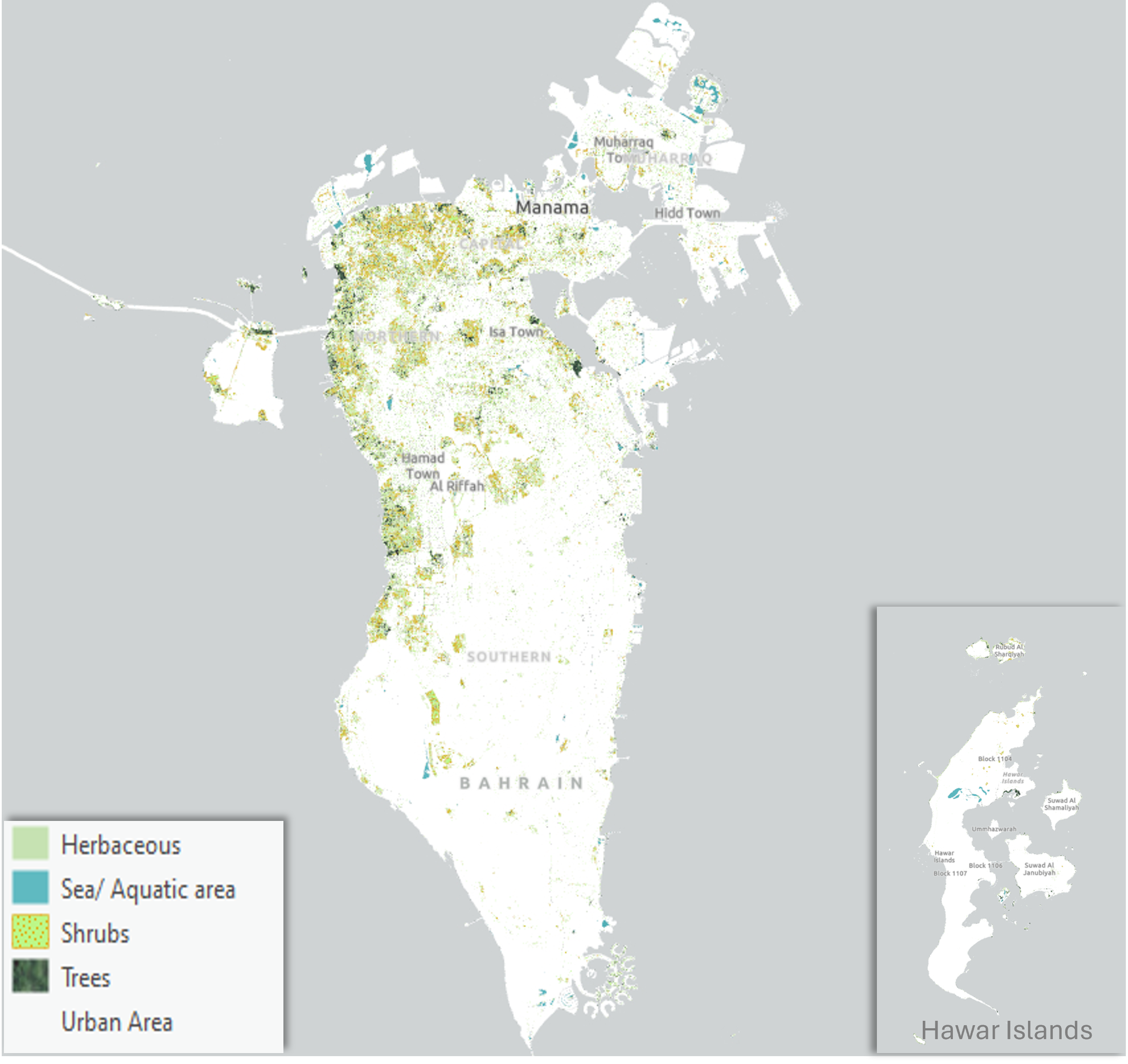 This classification of vegetation focus on classifying vegetation according to height , with the main classes being trees, which are the tallest, followed by shrubs and herbaceous plants. The purpose of this analysis is to understand the distribution and characteristics in terms of height of vegetation types in the Kingdom of Bahrain. The data source includes satellite imagery and ground surveys using remote sensing technology.